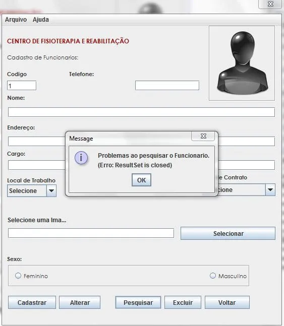 JOptionPane.showMessageDialog(null, "Problemas ao pesquisar o Funcionario.\n(Erro: " + ex.getMessage() + ")");