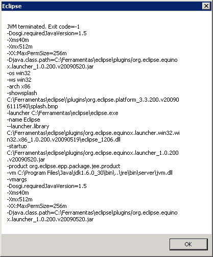 Depois disso ao tentar rodar o eclipse a seguinte tela é exibida não conseguindo abrir o eclipse, gostaria de saber como faço para corrigir este problema.