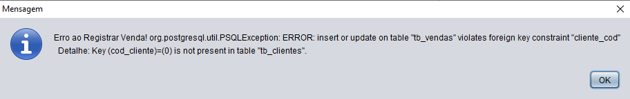 Estou tentando cadastrar uma venda no banco de dados mais esta apresentando este aviso de erro, ja olhe na tabela tb_clientes e consta o cliente cadastrado com seu código lá.
