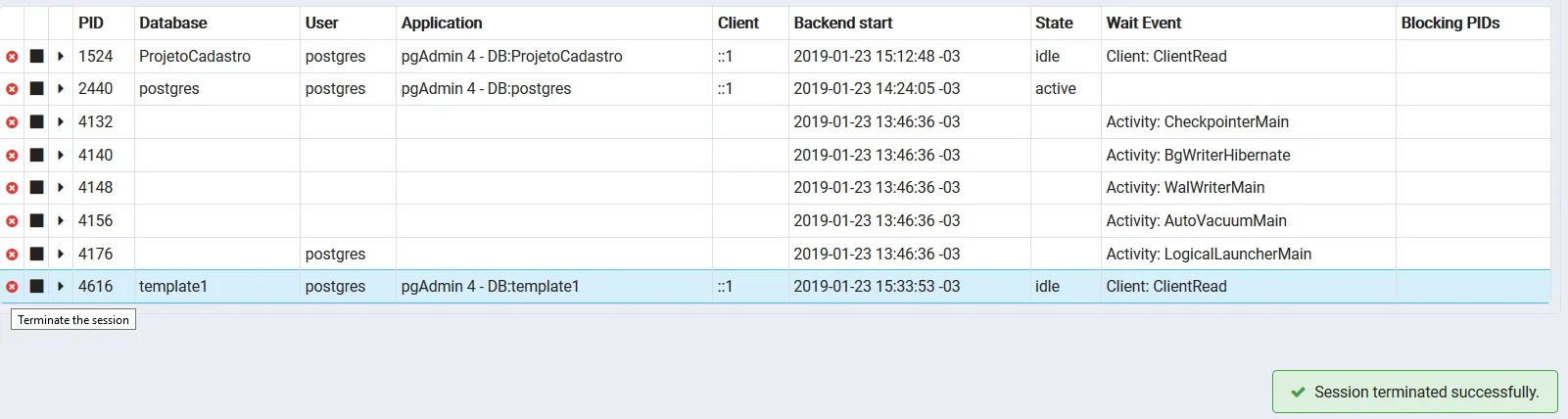 SELECT pid, pg_terminate_backend (pid)