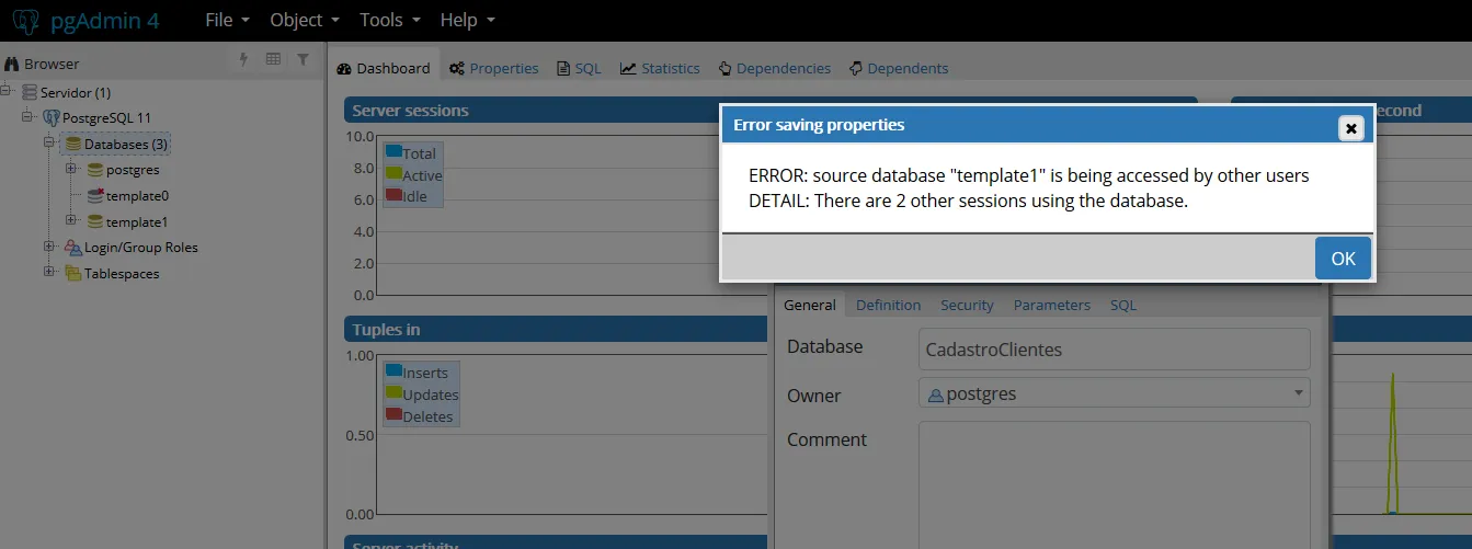 Tá falando que há outras duas seções utilizando esse banco de dados. Reiniciando o computador já resolve… Só é estranho não conseguir criar, isso deveria aparecer ao deletar. Reinicia o PostgreSQL e tenta de novo, caso não der certo, reinicia o pc