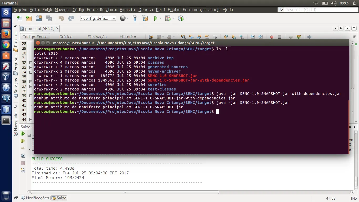 Coloquei esta configuração no meu pom.xml ao limpar e contruir, e construir com dependencias na pasta target agora estão sendo gerados 2 .jar, fui tentar executar e é gerado o erro abaixo nos dois .jar