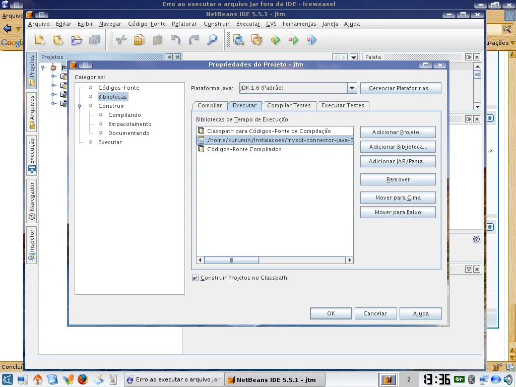Sou iniciante em Java e estou com um problema um pouco dificil de resolver. Estou utilizando o NetBeans 5.5, MySql, e Linux. Para realizar a conexão com o MySql estou utilizando o mysql-connector-java-3.2.0-alpha-bin.jar e por meio do NetBeans eu associei este connector à aplicação, fazendo com que o NetBeans adicionasse este connector ao classPath. Quando executo a aplicação pela IDE funciona tudo correto mas quando eu mando gerar o arquivo jar a aplicação trava na parte onde tenho de ler o driver do mysql. Quando digo trava quer dizer isto mesmo...não dá nenhuma mensagem de erro (apesar de em minhas classes, quando ocorrer algum erro eu estou gerando uma exceção para transmitir esta exceção para um bloco superior que mostraria a mensagem. Vou postar parte do código para ficar mais claro.