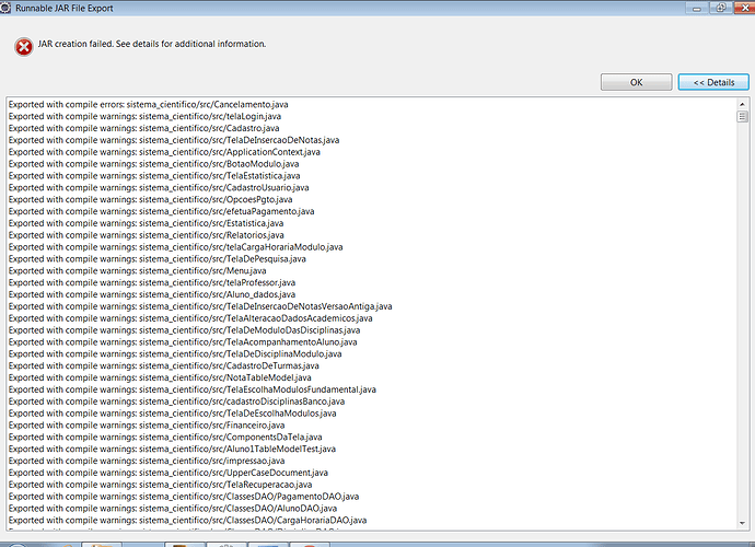 Alguém sabe por que esta ocorrendo estes erros(seguem em anexo)na hora de exportar um executavel .jar do eclipse?