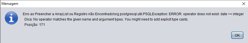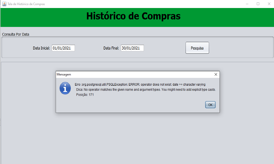 Estou tentando fazer uma consulta no banco de dados (PostgreSql) onde tenho uma tabela de compras e ela tem um campo que armazena as datas das compras. Bem Estou tentando consultar todas as compras realizadas em um intervalos entre duas datas, mas a mesma rertonar estes erros: