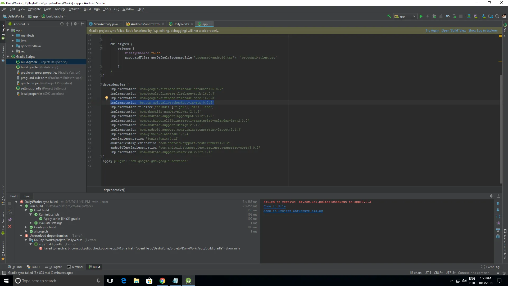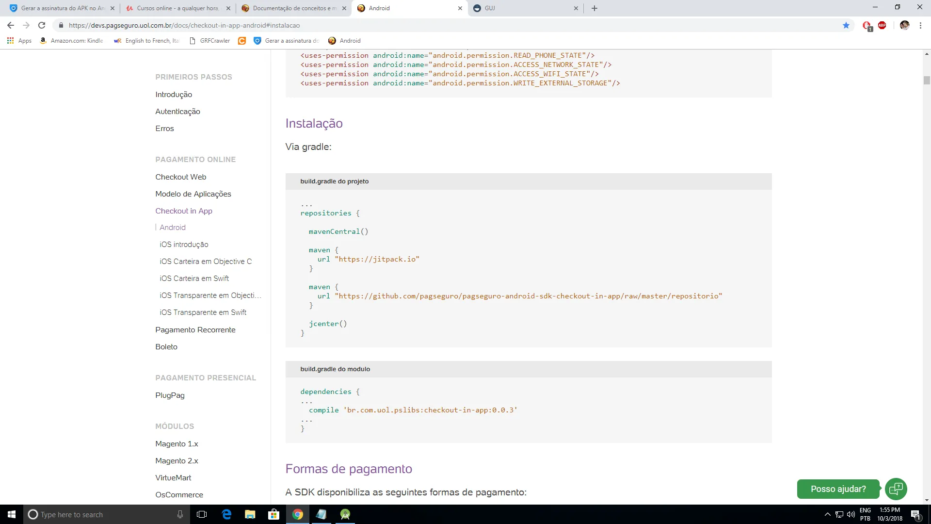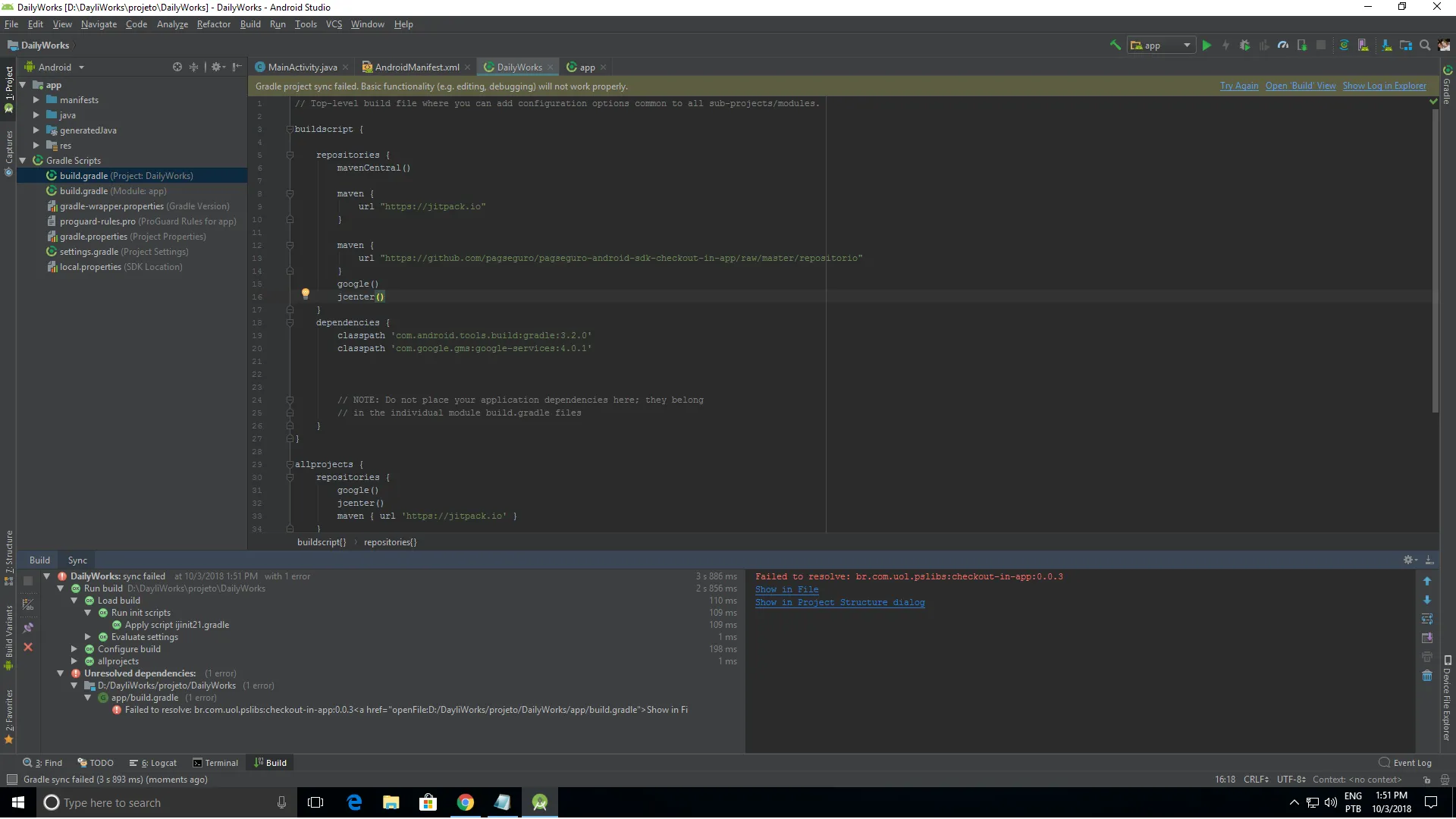 GUJ / Programação / Topico Erro ao implementar gradle ! HELP 3 de outubro de 2018 0 respostas androidjava T Tiago_da_Silva 3 de outubro de 2018 Galera estou com esse erro e fiz esatamente como esta no site e agora ??? erropay3.png1920×1080 103 KB erropaypal1.png1920×1080 120 KB erropagseguro2.png1920×1080 129 KB Alura Desenvolvimento Mobile com Flutter Aprenda a criar apps completos com autenticação via API, segurança e práticas de mercado.... Criado 3 de outubro de 2018 Respostas 0 Participantes 1 Topicos relacionados Ler 10 números e dizer o maior e o menor Resolvido 36 respostas [RESOLVIDO] Erro fuso horario mysql Resolvido 6 respostas Documentação java em português 9 respostas Qual a diferença entre C , C++ , C# 2 respostas [Resolvido] PKIX path building failed: sun.security.provider.certpath.SunCertPathBuilderException: unable to find valid certification path to requested target 1 respostas Alura Sistemas operacionais: entenda seu conceito e suas funções Descubra o que são sistemas operacionais, suas funções e tipos. Aprenda tudo de forma clara e objetiva. Não perca tempo! Casa do Codigo Desbravando SOLID: Praticas avancadas para codigos de... Por Alexandre Aquiles — Casa do Codigo