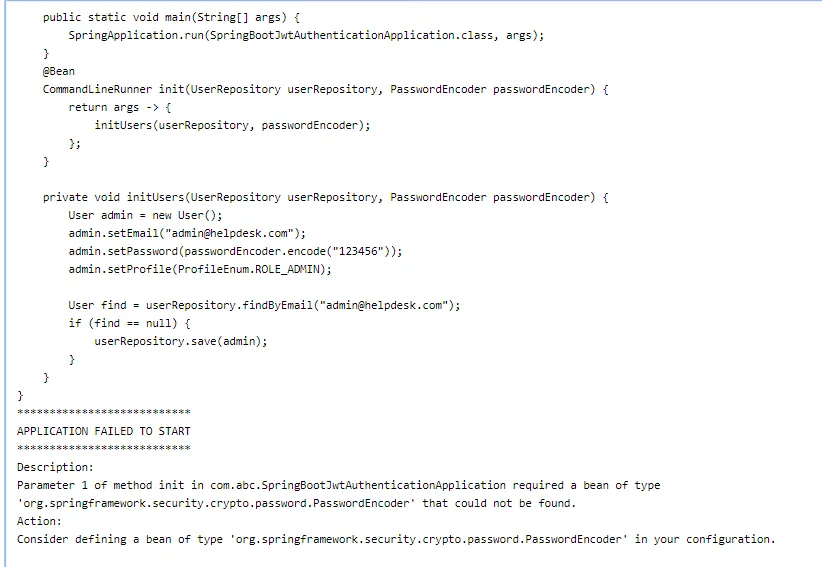 No próprio erro ele informa que espera um Bean do tipo org.springframwork.security.crypto.password.PasswordEncoder que não foi encontrado.