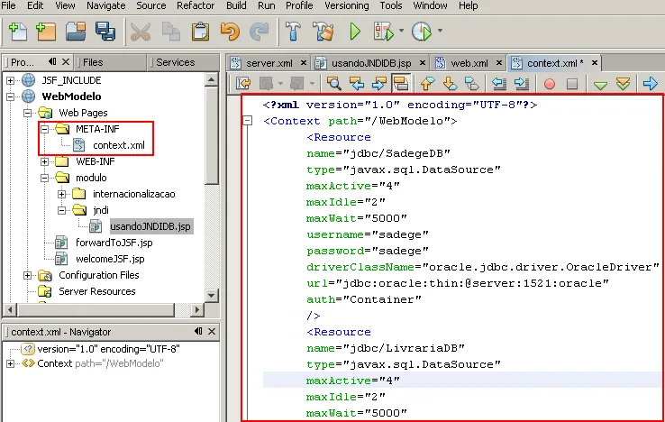 Abaixo o código com dois JNDI, um para acessar o Oracle e outro para acessar o MySQL.