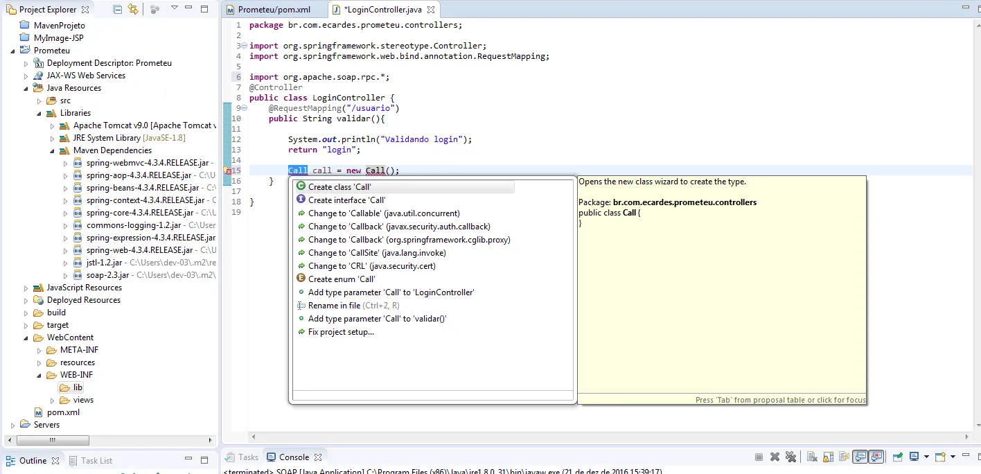 Tudo ia bem e fluindo até que precisei utilizar a biblioteca acima. A dependência é importada normalmente como é possível ver na imagem que segue com a estrutura do projeto. O problema é que não consigo acessar de forma alguma a classe Call presente em org.apache.soap.rpc! O que pode ser? Acredito ser algum problema no ambiente de desenvolvimento, talvez nos arquivos do Eclipse, mas como limpá-los se for este o caso?