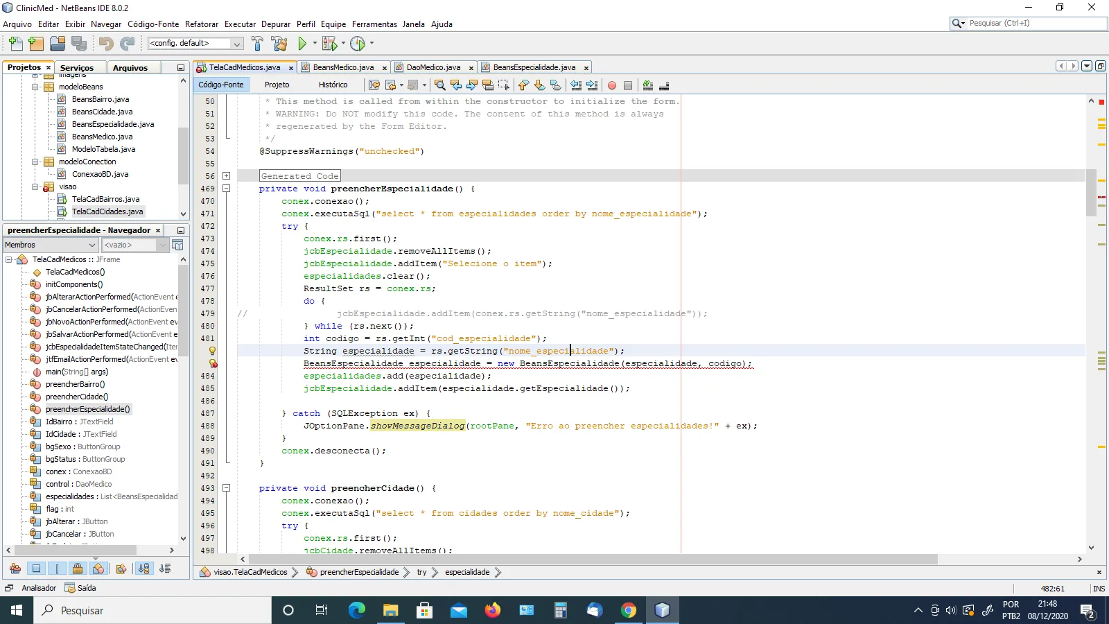 Classe BeansEspecialidade.