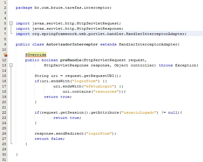 Olá pessoal, estou seguindo o curso FJ-21, e no exercício 12.8 (interceptadores com Spring) estou tendo dificuldades ao tentar sobrescrever o método preHandle da classe HandlerInterceptorAdapter. A mensagem que recebo é: