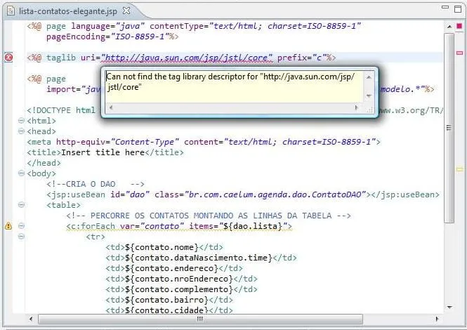 Boa noite pessoal, estou com um problema para utilizar a JSTL, adicionei no diretório lib (workspace\nome_do_projeto\WebContent\WEB-INF\lib) o .jar da API e da Implementation da JSTL, porém está aparecendo o erro anexo.