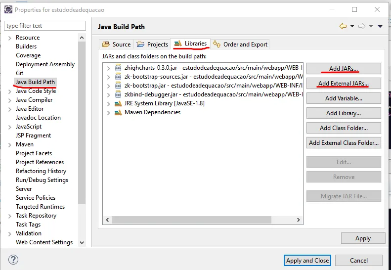 *Se você não tem a biblioteca dentro de um dos diretórios do seu projeto use a opção ‘Add External Jars’.