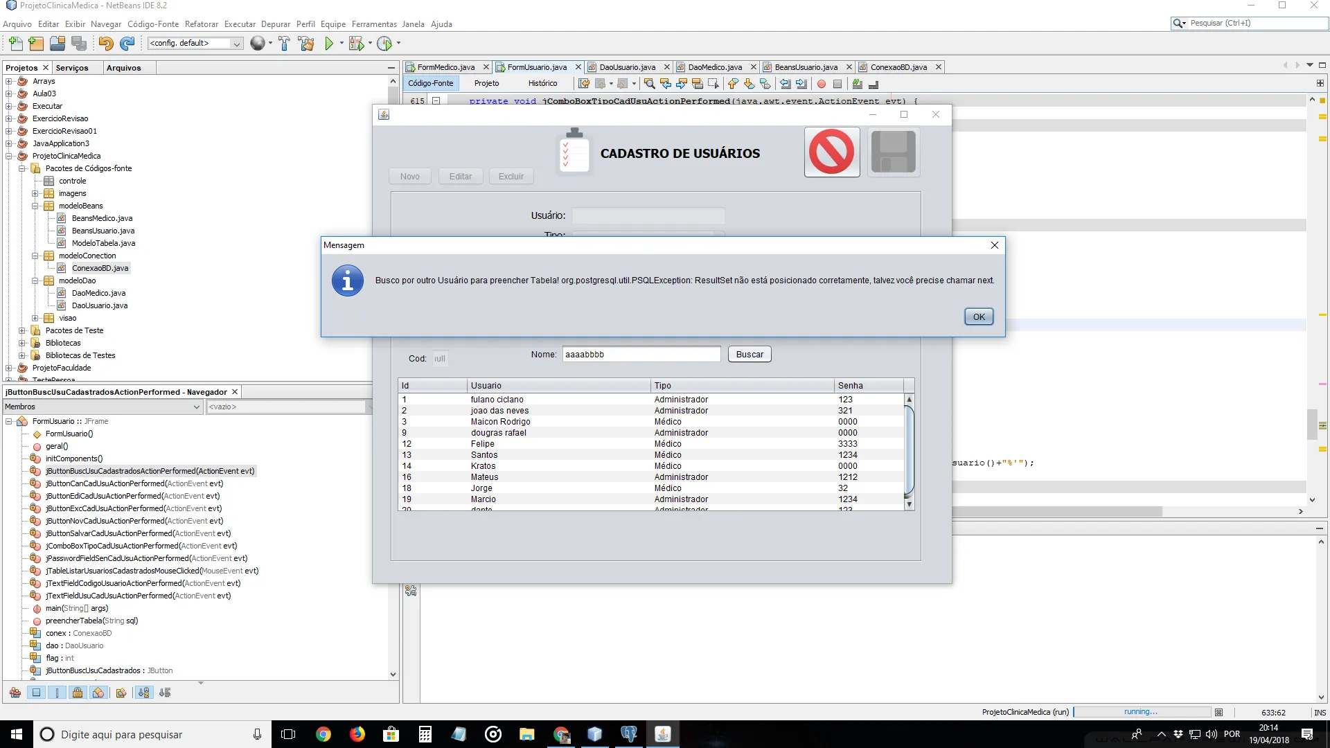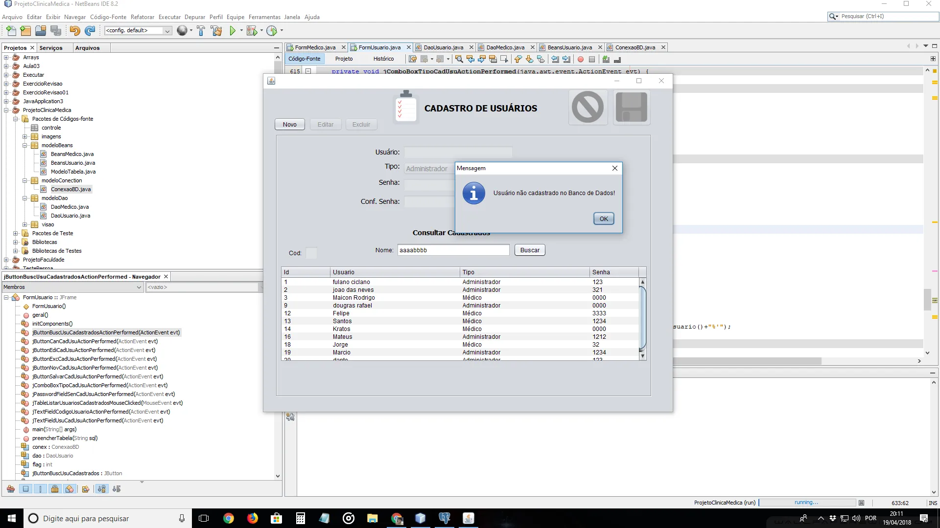 Eu ponho um usuario que n existe no banco, e ele me retorna o JOption normalmente: