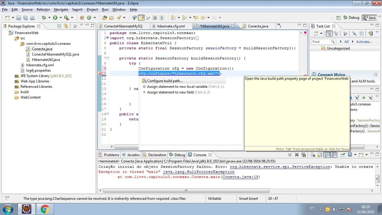 at com . livro . capitulo3 . conexao . Conecta . main ( Conecta . java : 18 )
