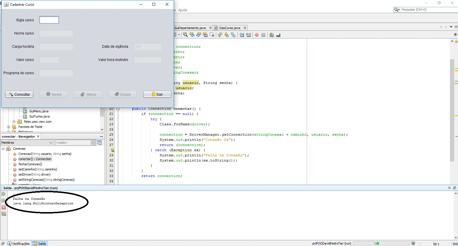 System.out.println("Falha na Conexão");
