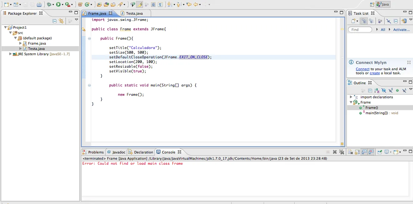 Estou a criar uma nova janela básica com o JFrame em java e apesar de já ter tentado de várias formas e ter praticamente a certeza de que estou a inserir o código corretamente aparece-se sempre o seguinte erro que se encontra em anexo quando tento compilar