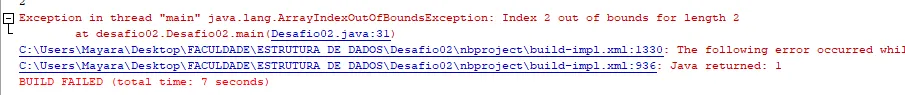 C:\Users\Mayara\Desktop\FACULDADE\ESTRUTURA DE DADOS\Desafio02\nbproject\build-impl.xml:936: Java returned: 1