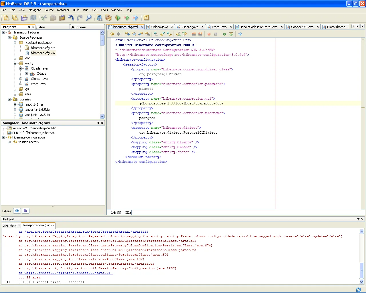 Caused by: org.hibernate.MappingException: Repeated column in mapping for entity: entity.Frete column: codigo_cidade (should be mapped with insert=“false” update=“false”)