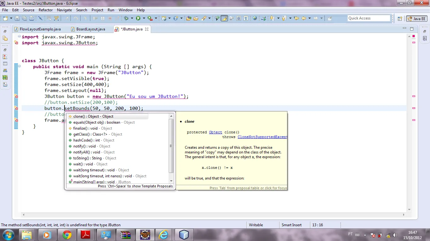 importjavax.swing.JFrame;importjavax.swing.JButton;publicclassBotaoextendsJFrame{publicBotao(){JButtonbutton=newJButton("Eu sou um JButton!");//button.setSize(200,100); button.setBounds(50,50,200,100);//button.setBackground( Color.WHITE ); add(button);setVisible(true);setSize(400,400);setLayout(null);setDefaultCloseOperation(EXIT_ON_CLOSE);}publicstaticvoidmain(String[]args){newBotao();}}