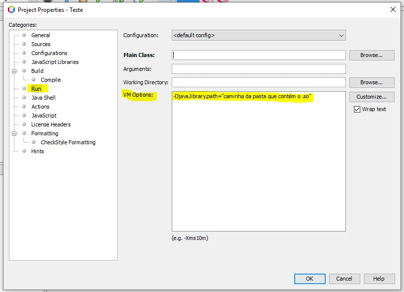 -Djava.library.path="…/…/Documentos/lib/amd64"