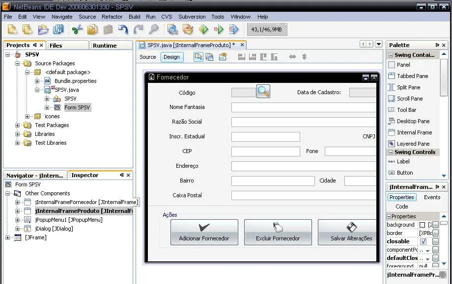 Quando clico em jInternalFrameFornecedor, aparece a janela do InternalFrameFornecedor para que eu possa inserir objetos nele e concluir a programação necessaria…