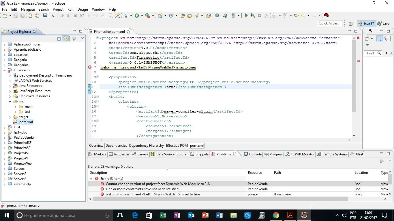 Olá, Gostaria de dizer que já fazem alguns dias que tento e não consigo remover este erro no meu pom…para que eu possa dar avanço no meu aprendizado de JSF