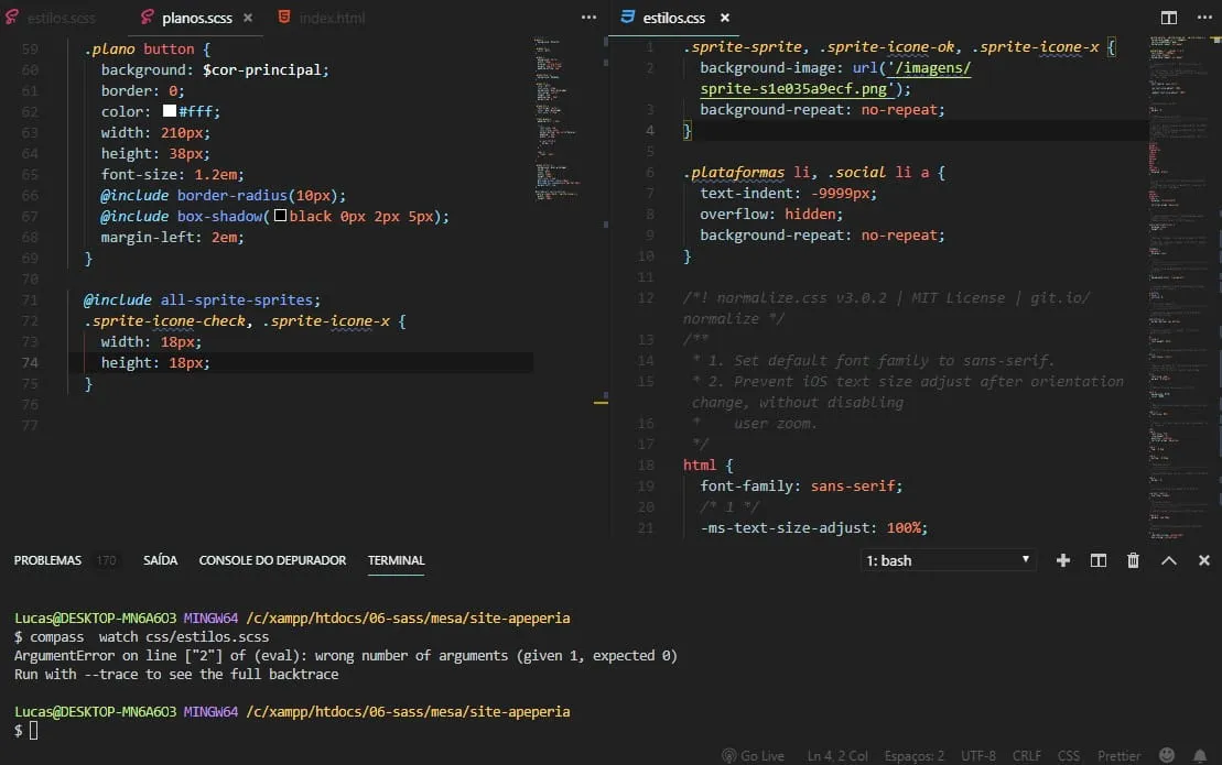 Boa noite pessoal estou com um erro aqui no meu sass, to fazendo o curso de sass da Alura estou no capitulo de automação de sprites porém ao tentar rodar o watch no terminal da erro na linha 2, porém pelo que olhei esta certo o caminho.