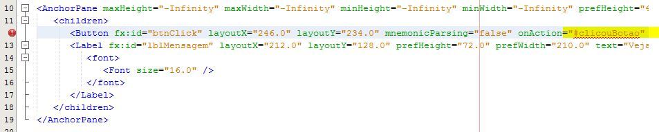 criei um método no Scene Builder com o nome de clicouBotão, porém o mesmo não reconhece e aparece o seguinte erro:
