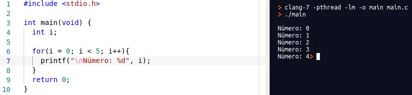 A estrutura básica para o “for” funcionar é essa, precisamos primeiro declarar uma variável inteira, após isso teremos que informar o valor inicial dessa variável, no nosso caso 0, dizer qual será o intervalo que queremos que seja executado o nosso código, nesse caso até quando o valor da nossa variável i for menor que 5 por fim dizer se a nossa variável será incrementada (++) ou decrementada (–), nesse caso será incrementada até chegar ao valor 5.