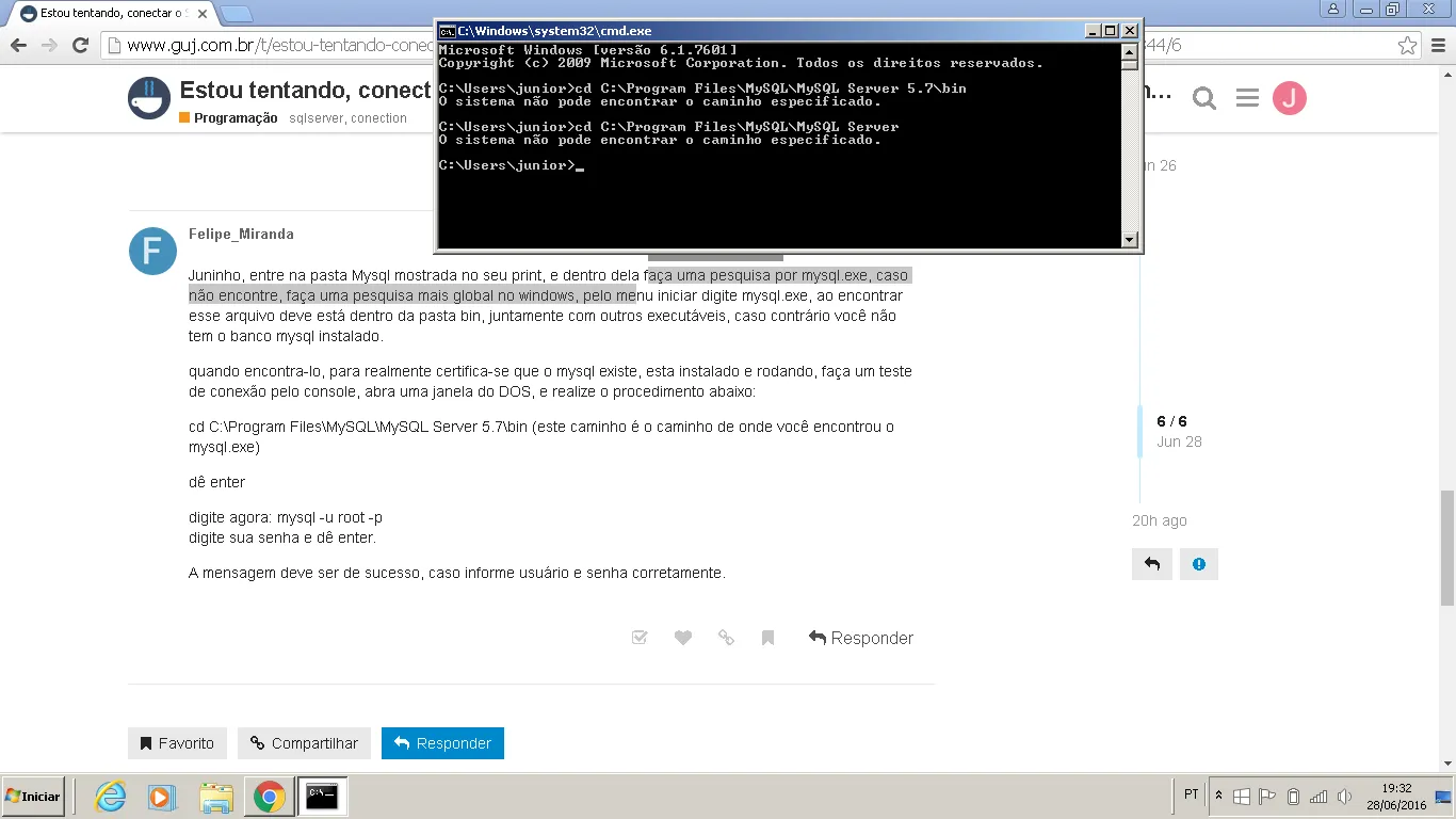 cd C:\Program Files\MySQL\MySQL Server 5.7\bin (este caminho é o caminho de onde você encontrou o mysql.exe)