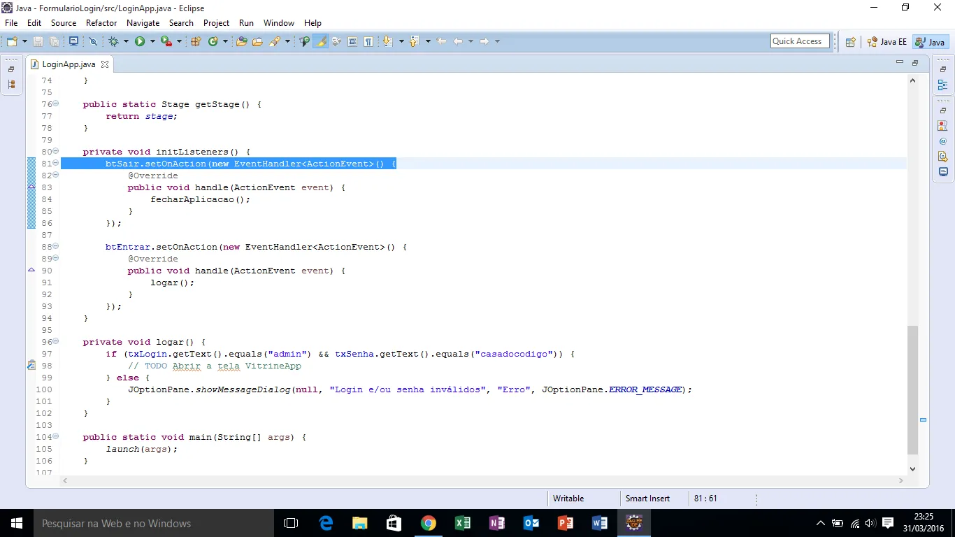 if (txLogin.getText().equals("admin") && txSenha.getText().equals("casadocodigo")) {