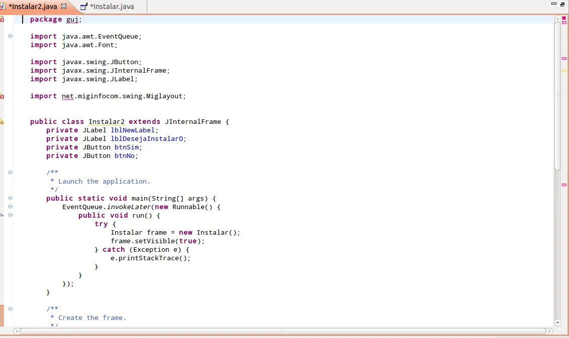 pessoal, estou com uma duvida, porque depois q eu monto o design do meu programa em java ele n compila? Quando eu colocava o botoes e as caixas no c ele compilava normal... porque isso não acontece no java? estou fazendo algo errado? Fiz um form bem simples e o eclipse n compilo (n editei nada) como devo proceder?
