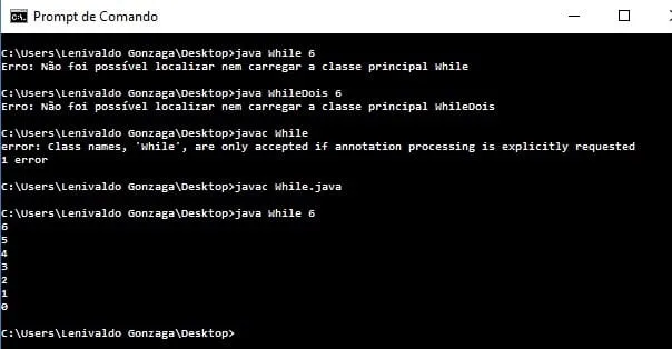 01 Lancei o programa no bloco de notas e salvei como While.java na áre de trabalho mesmo (Não utilizei extensão .txt mas todos os arquivos.
