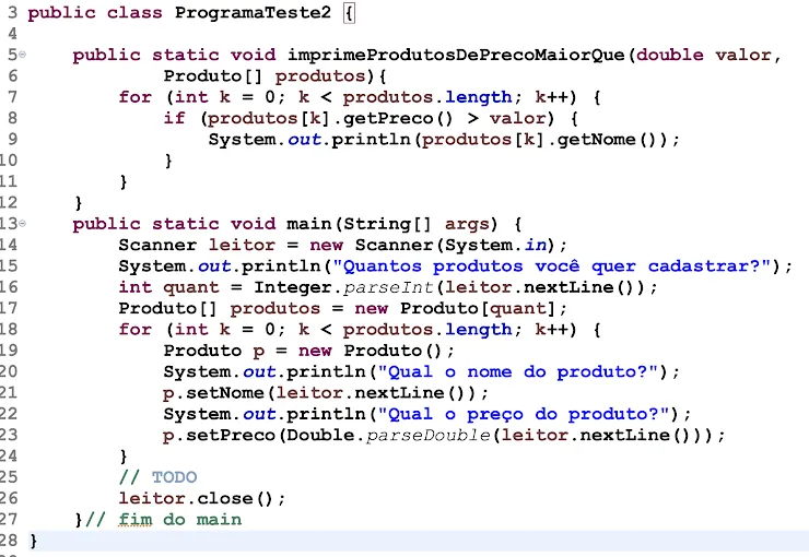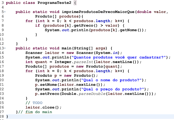 Considere uma classe com os métodos abaixo e cujo main precisa ser completado para que imprima os nomes dos produtos cujo preço é maior que 100 reais. Que linha você adicionaria na parte //TODO do código para que isso aconteça?