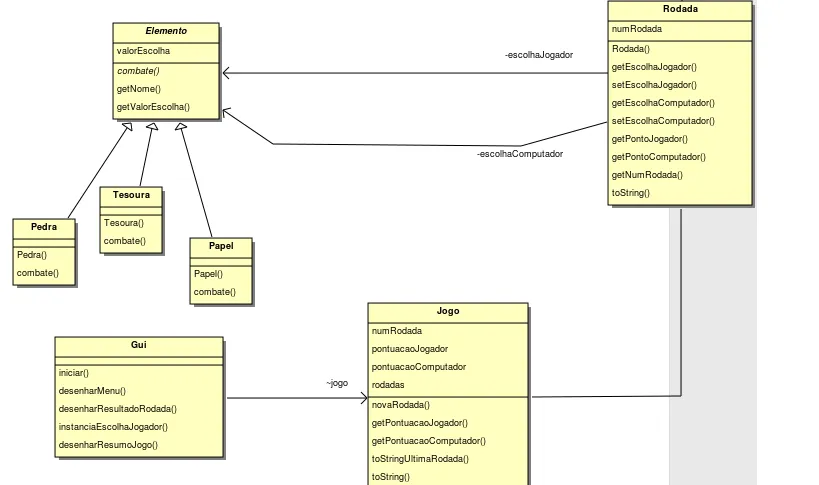 Na classe Rodada, crie um construtor que receba um parâmetro a ser atribuído como número da rodada, crie um método get para retornar o número da rodada. Crie atributos do tipo Elemento para o jogador e o computador, cada um destes atributos será utilizado como escolha da rodada. Crie os métodos set e get para eles. Para o método set de escolha do computador, não permita que um parâmetro seja passado, ao invés, gere aleatoriamente (com Math.Random [pesquisar] - (int)(Math.random() * 3) + 1) a escolha.