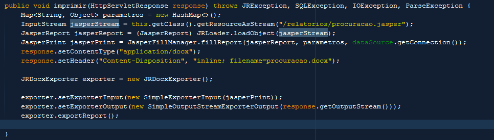 Preciso exportar um arquivo em formato docx com jasper, mas não tenho ideia de como faze-lo , os exemplos que peguei até agora só mostra partes do código , estou tentando assim