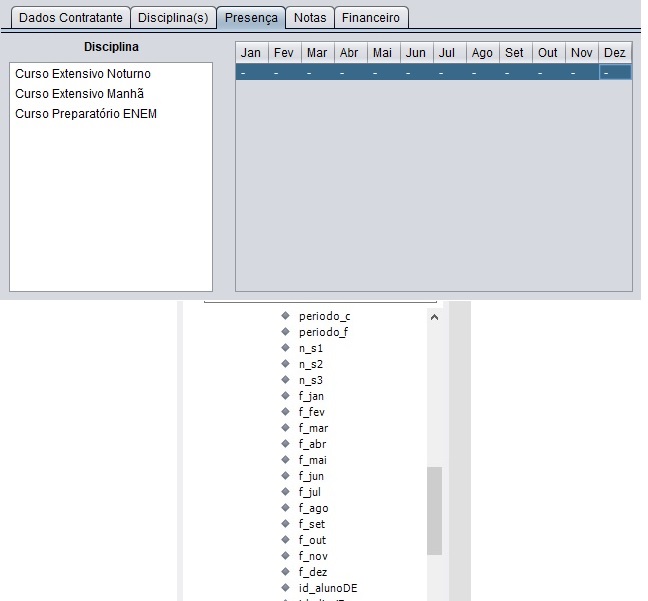 Estou desenvolvendo um sistema para um Cursinho Particular, na interface de perfil de aluno vou exibir as disciplinas escolhidas por ele e na frente em uma jTable exibirei as faltas conforme os meses do ano, segue a imagem abaixo da interface e do banco de dados para representar suas respectivas faltas …