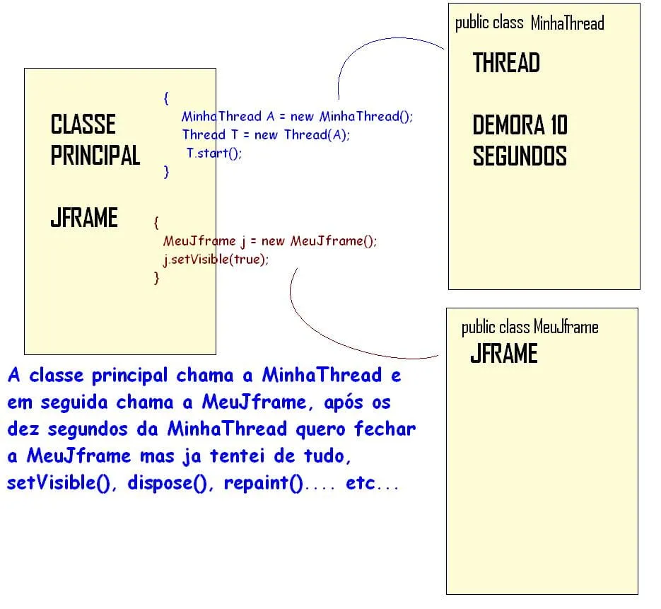publicclassMinhaThreadimplementsRunnable{publicFilhofilho;@Overridepublicvoidrun(){try{Thread.sleep(10000);filho.dispose();// <<<<<<<<<<<<<<<<<<<<<<<<<<<<<<<<<}catch(InterruptedExceptione){// TODO Auto-generated catch blocke.printStackTrace();}}}