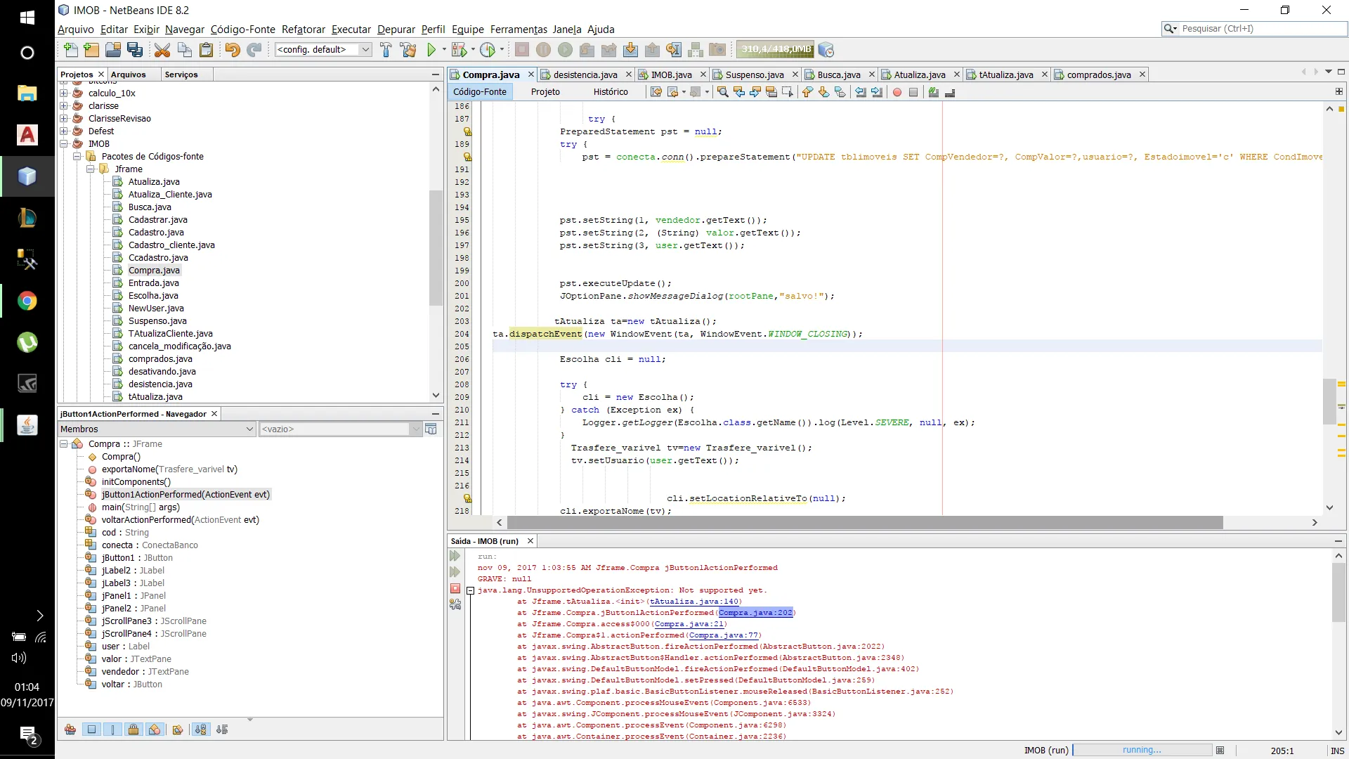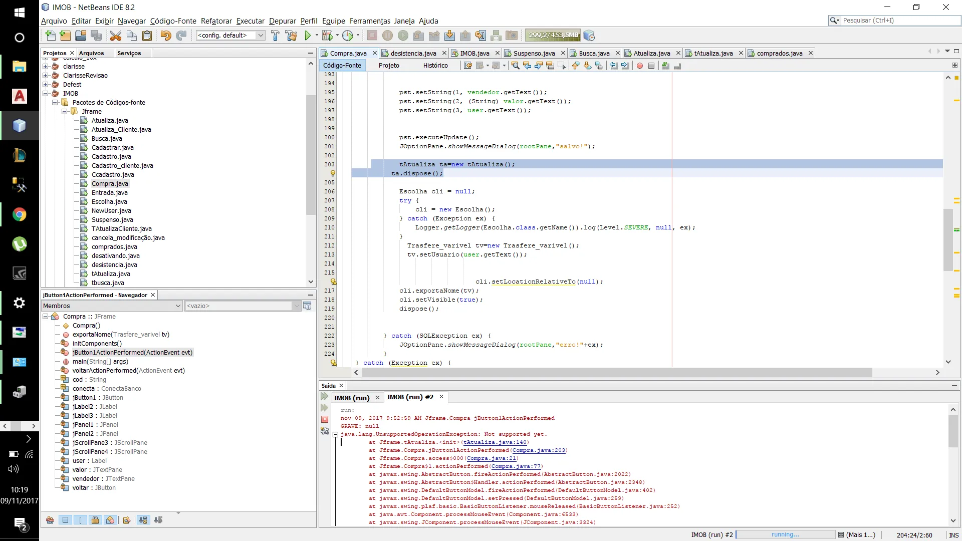 isso ai era um erro que ocorreu quando tentei fazer o Jframe tAtualiza fechar com um comando ai coloquei um comando e nao estava funcionando ja tirei ele so que ainda nao sei como irei fazer para o Jframe tAtualiza fechar quando eu aperta o botao no Jframe compra… ja tentei varios metodos e ate agora nada.