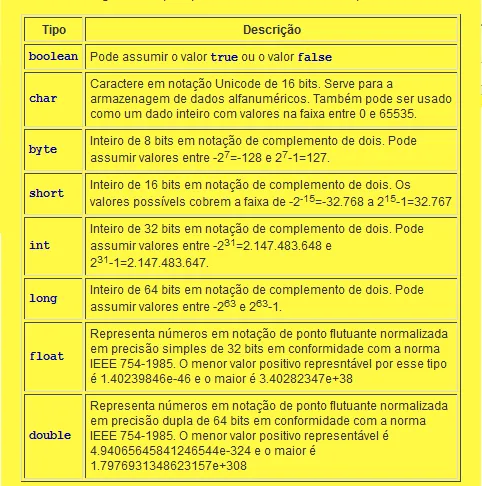 Com créditos para http://www.dm.ufscar.br/profs/waldeck/curso/java/part22.html, analise a tabela a seguir: