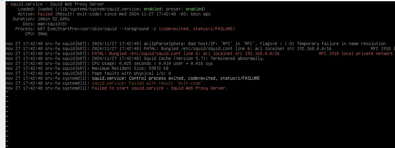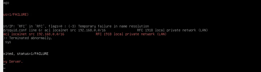 Pelo log que o senhor enviou acima o Squid está sugerindo adicionar regras para lidar com os endereços da RFC 1918 no proxy. Isso pode ser relevante para: