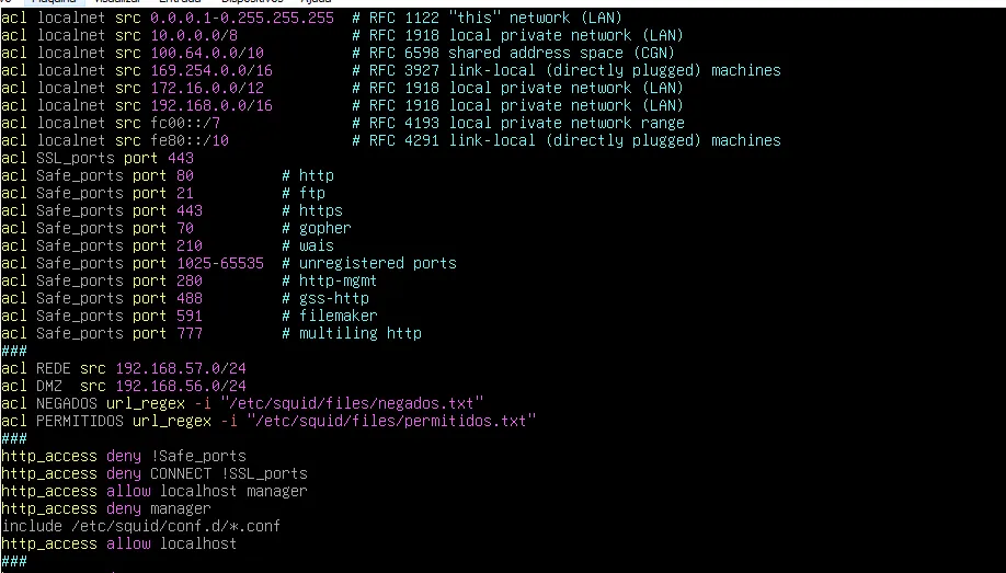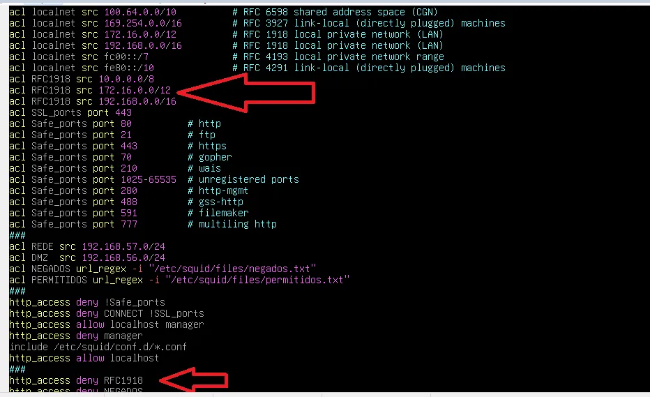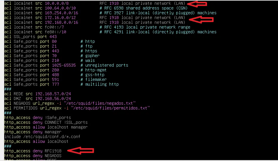 Vá até o arquivo de configuração do Squid o squid.conf que geralmente está no caminho /etc/squid/squid.conf e o abra usando o modo de administrador ou seja o sudo mais o editor, tipo assim sudo nano /etc/squid/squid.conf e o senhor pode adicionar as regras para endereços RFC 1918. O senhor pode adicionar as seguintes linhas ao arquivo, geralmente próximo das configurações de ACL (Access Control Lists):