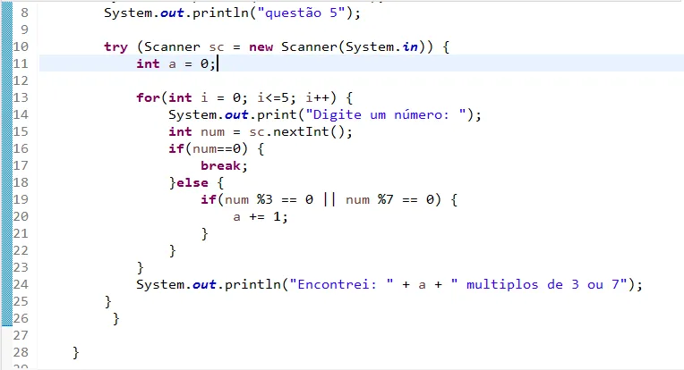 c) se o número for 0, encerre o programa e mostre na tela qual o valor da primeira posição (para quantos números divisíveis por 3) e qual o valor da segunda posição (para quantos números divisíveis por 7 foram digitados).