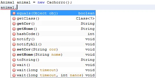 Nesse caso a variavel a (do tipo Animal) só vai conter os métodos da classe Animal.