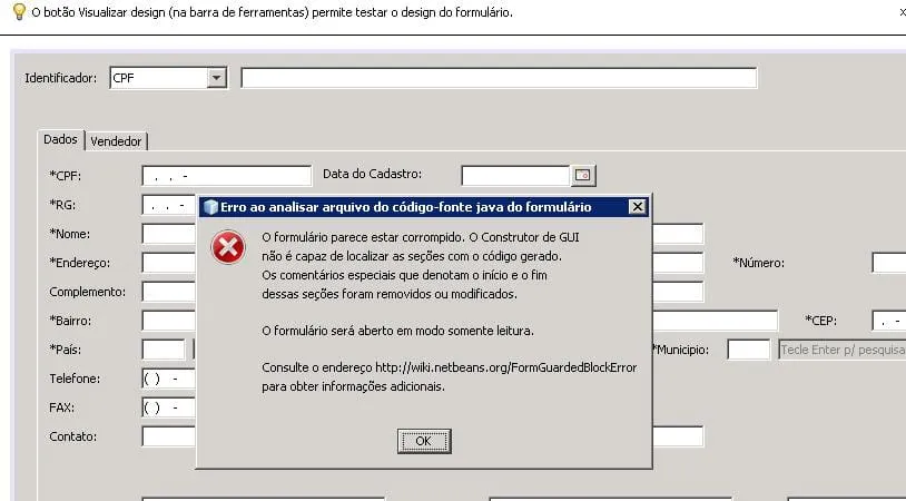 estou com o seguinte problema na imagem abaixo em meu formuario, gostaria de saber se tem alguma solução ou somente um backup resolveria o problema.