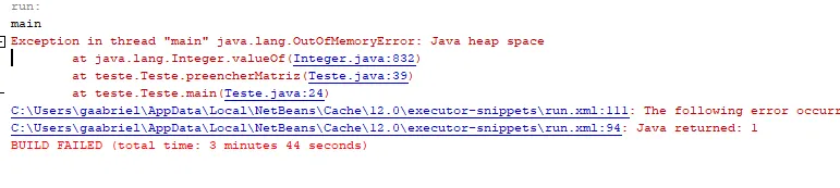 Estou gerando uma matriz muito grande de números aleatórios, a matriz tem o tamanho de 20.000X20.000 (400 Milhões de posições) como a matriz é muito grande precisei aumentar o tamanho da heap da JVM (para evitar o erro Exception in thread “main” java.lang.OutOfMemoryError: Java heap space) compilando usando o seguinte comando: