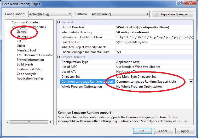 Se você não está usando Windows Forms, pode deixar marcado como “No Common Language Runitmie Support” ou coisa parecida