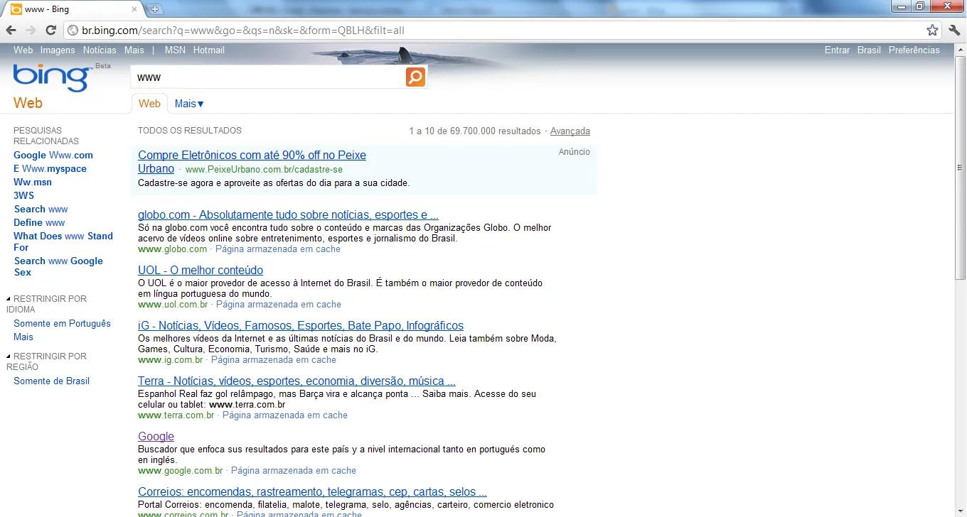 Por curiosidade hoje acessei o google e o bing. Fiz algumas pesquisas comparativas.