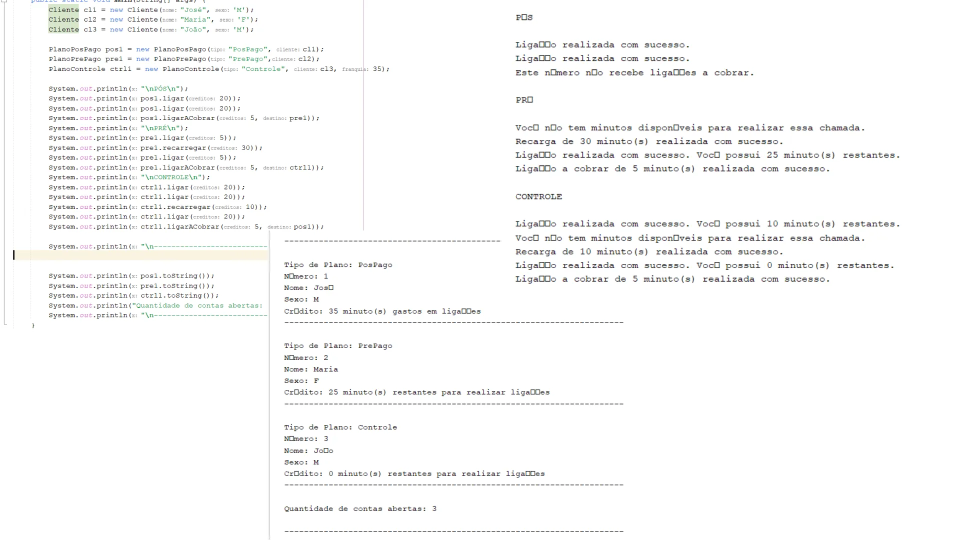 O código está basicamente todo pronto, porém ao fazer o plano Pós Pago receber ligações a cobrar, meu código requer que o crédito seja descontado de sua franquia, consequentemente fazendo com que a tela de informações não mostre quanto de crédito ele usou ao fim do mês, assim subtraindo do valor em vez de adicionar